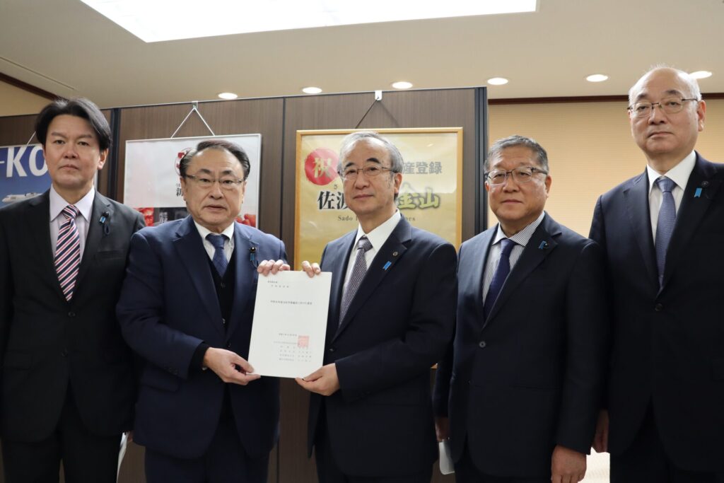 県連四役(岩村良一 幹事長、中村康司 総務会長、高橋直揮 政務調査会長、与口善之 議会対策委員長)は、12月26日、令和8年度当初予算編成に向けた要望書を花角知事に手交しました。