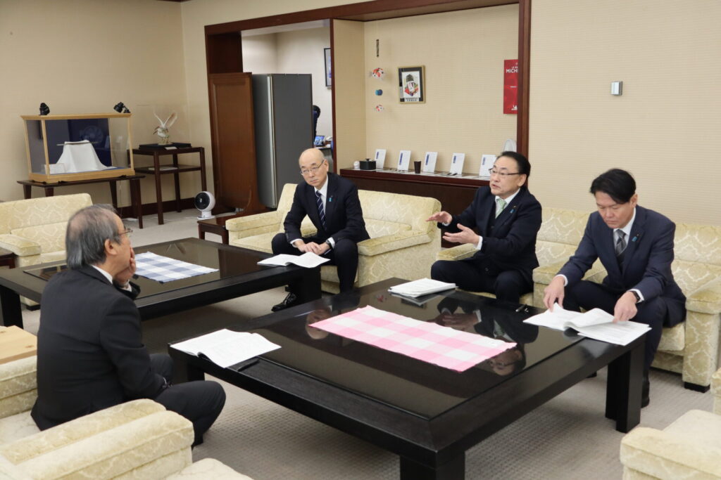 岩村良一 幹事長、高橋直揮 政務調査会長、与口善之 議会対策委員長は、1月26日、花角知事と面会し、令和8年度予算編成に係る要望を約1時間にわたり行いました。今回の要望は、県内友好団体から寄せられた多岐にわたる意見・課題を取りまとめたもので、県民生活の安全・安心を守り、地域の活力を維持・向上させるために必要な施策を幅広く盛り込んでいます。